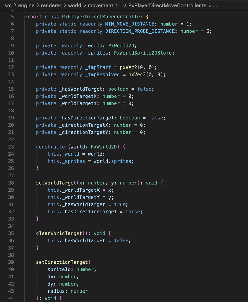 This also made it much easier to support different input styles cleanly. Movement is no longer just click to move. WASD and analog stick input are now first class, and they plug into the same system without any special cases. Directional input feeds directly into the direct movement controller, while pointer input sets a world target that can either be reached directly or fall back to pathfinding if needed.
