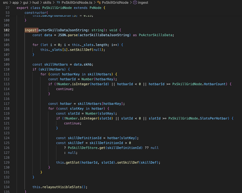 On the data side, the player skills message is now hooked up as well. The client ingests the incoming skill definitions into a shared store, ingests the actor skill data for the main player, and then the skill grid resolves what each slot should show from there. That ended up being the right shape. The definitions live centrally, the grid consumes them, and the individual slot nodes are only responsible for presentation and interaction.