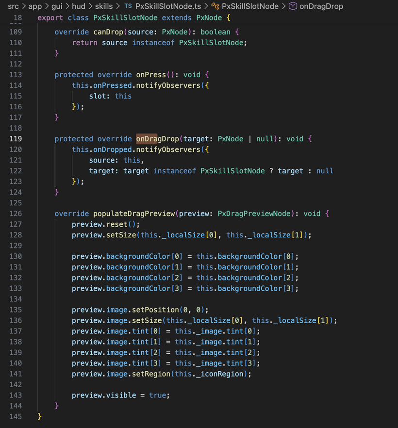 That also means the slot itself controls what its drag preview looks like. Right now for skills that is just the slot background and icon, but later on the same approach can be used for stack counts, ranks, item quantities, or whatever else a dragged thing needs to show. It is a much better shape than trying to hardcode drag behavior in one central place.