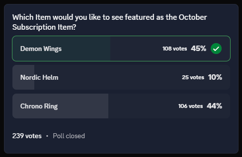 Holy cow! That was an extremely close poll to determine the winner of the subscription exclusive item for October! The Chrono Ring put up an amazing fight but in the end just two votes decided the winner... The Dragon Wings! Formally known as the Demon Wings during the polling period.
